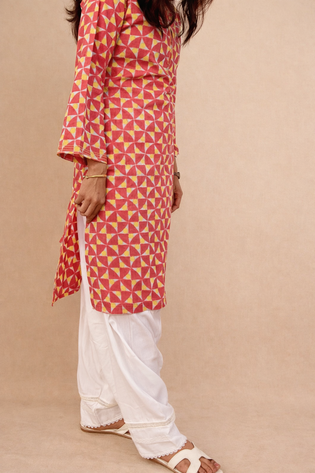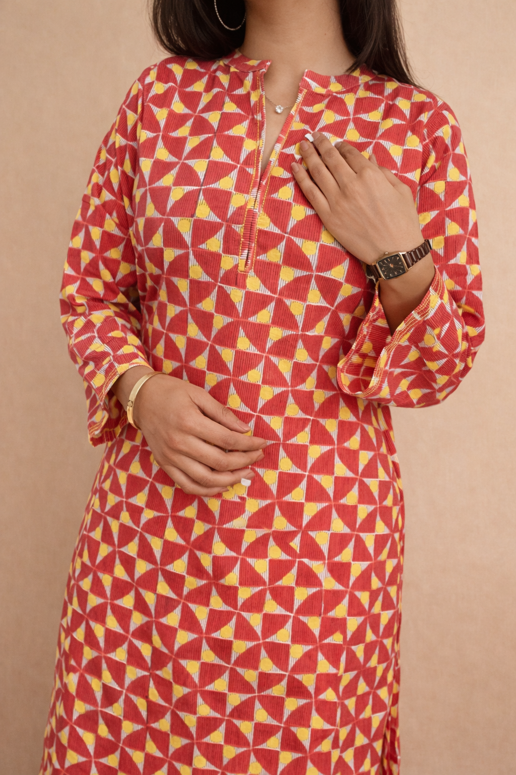 Add a vibrant touch to your everyday wardrobe with this striking red printed kurti, featuring geometric motifs highlighted with bright yellow accents. Designed with a classic round neckline and a subtle front slit detail, this kurti blends traditional charm with modern simplicity. The full sleeves and straight silhouette create a polished yet comfortable look, making it perfect for office wear, casual outings, or festive daytime gatherings. Crafted in breathable cotton fabric, it ensures all-day ease without compromising on style.